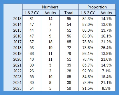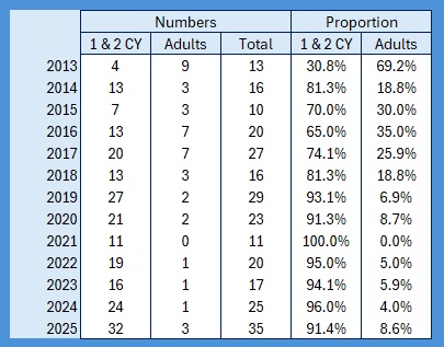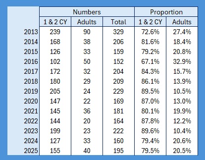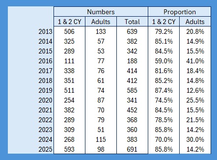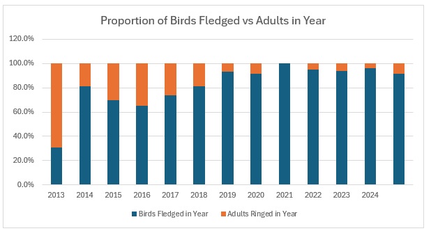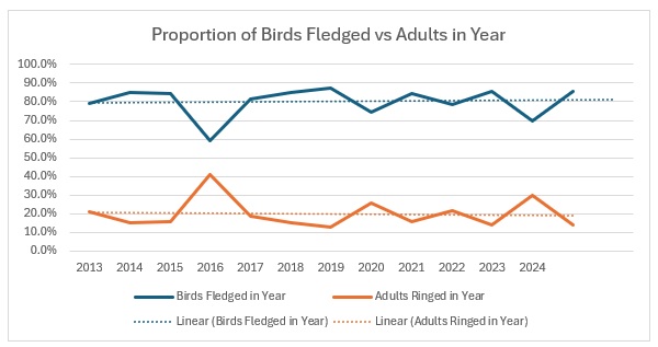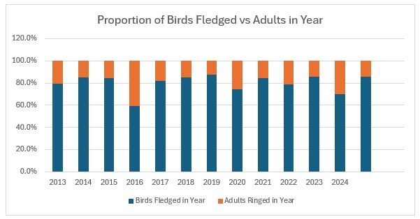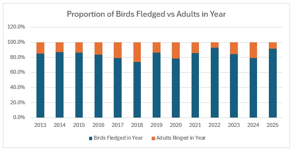 Unfortunately, I don’t have the breakdown for 2025 between adults and juveniles for the rest of England or Wiltshire but the breakdowns up to and including 2024, plus 2025 for the West Wilts Group and the Braydon Forest are worthy of looking at. To be as accurate as possible, there are always a few birds that are impossible to age accurately. I have decided to include them in the adult figures and focus only on those that are definitely juveniles.