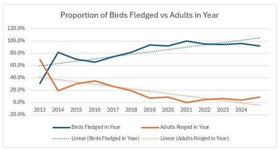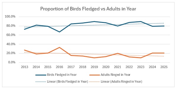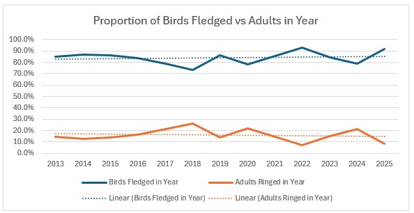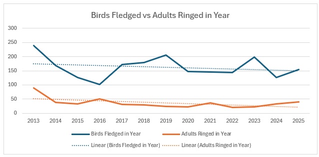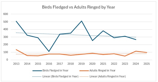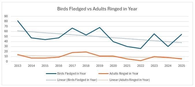 Our group has had a phenomenal year for Blue Tits in 2025: with a one-third increase in adults and pulli ringed. Again, I will be waiting for the release of the ringing figures for 2025 before I can be definitive. What I have done with the graphs is stick to full data, as much as possible. The figures I have published exclude pulli ringed, as that has only been a part of our activity since Jonny took over the Wiltshire Wildlife Trust sites at Green Lane Wood and Biss Wood and started ringing pulli there and a few other areas in 2023.