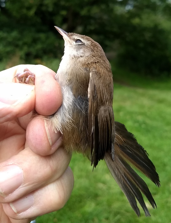 The catch for the day was: Treecreeper 1; Blue Tit 2; Wren 5; Dunnock 2; Robin 4; Blackbird 1; Garden Warbler 2; Lesser Whitethroat 1(1); Cetti’s Warbler 1(1); Blackcap 7(1); Chiffchaff 1(1); Willow Warbler 1. Totals: 28 birds ringed from 12 species and 4 birds retrapped from 4 species, making 32 birds processed from 12 species. All birds were this year’s birds except for the retrapped Blackcap and Cetti’s Warbler, one of the Chiffchaffs, both Garden Warblers and the Willow Warbler.