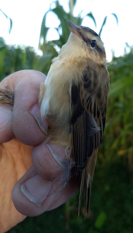 As well as these we saw, but did not catch, a few other migrants, notably a good number of Swallow flying around the fields and a Wheatear flying across from where we had our nets along the hedgerow by the newly sown crop across to the track, and a few Yellow Wagtail were heard but not seen. We were also visited by a female Sparrowhawk, who made a spectacular crossing of the maize field, and twisted up and soared away right in front of me when she noticed our ringing station. I would have loved to have had that in the net! Bad for your fingers though.