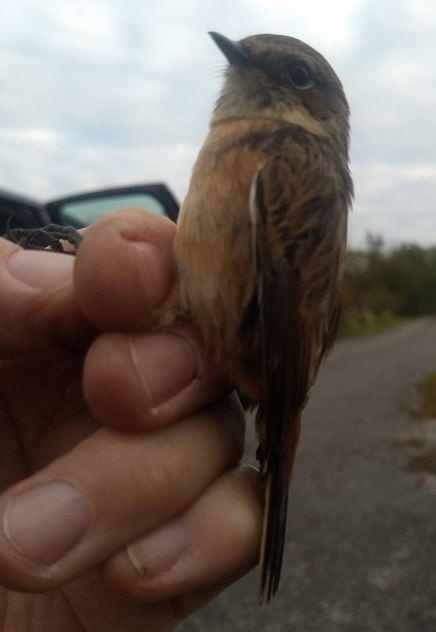It was a frustrating start but we had a very pleasant morning with a decent haul of birds: not many species and mainly Meadow Pipits, but a good looking juvenile male Stonechat and a lovely haul of Reed Bunting: