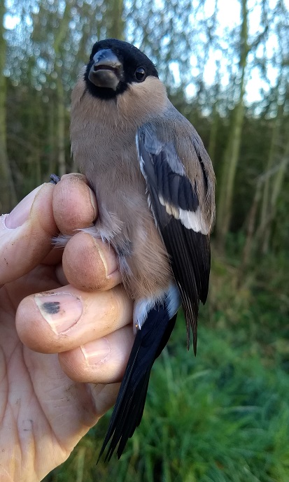 Today’s catch was: Blue Tit 3(3); Great Tit 4(4); Long-tailed Tit 2(1); Wren 1; Dunnock 1; Redwing 3; Blackbird 2; Chiffchaff 1; Goldcrest 3(3); Bullfinch 1. Totals: 21 birds ringed from 10 species and 11 birds recaptured from 4 species, making 32 birds processed from 10 species.