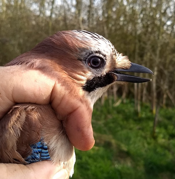 I love Jays, and this is the first that I have caught since one at Ravensroost Meadows in July of last year. Yes, they have sharp claws on their feet (I gave it a pen to hold, seems to occupy them) and if that beak gets you they draw blood (I bled) but they are beautiful. The Care Farm staff were out and about with their charges this morning and whilst chatting to one of the staff he said that he always thinks of Jays as the UK’s equivalent of parrots: that raucous voice and stunning plumage. He has a point. This was a second year female bird.
