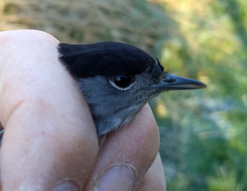 One of the interesting finds in today’s catch were a couple of Blackcaps that could be aged as last year’s birds. With partial moults over winter for both adults and juveniles it is often difficult to age birds of last year, and one usually uses the code 4, which means older than current year but unable to determine which year. This male bird in particular, as well as having retained two greater coverts from last year (a juvenile characteristic), had a lot of brown in its black cap: