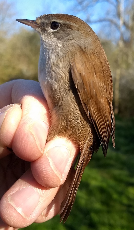 Working solo at Lower Moor Farm this morning, I set up just my three main net rides: a total of 8 x 18m nets. It was a pre-CES warm up as, because of other peoples’ commitments, I expect to do quite a number of those sessions working solo. The first session will be in two weeks time. Hopefully we will have a few more birds from more species around by then. There are a few of our summer visitors on site, but no Garden Warbler, Whitethroat or Lesser Whitethroat to be seen yet.