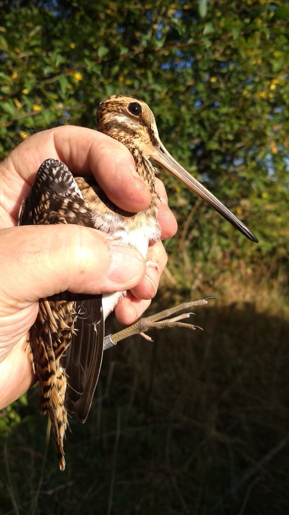 We have caught Snipe – on the ponds at Blakehill Farm, using specific wader nets and lures in January 2019 and 2020. This is the first time that I have even seen Snipe at this site. It was a cracking catch. Looking back over the Group’s historical records (those that are on-line, anyway), way back to 1986, there are only 3 other instances of Snipe being caught in September – 2001 and 2009 at Swindon Sewage Treatment Works and 2006 in Nightingale Wood. Mind, one of the 2009 catches is special to me: that’s when I ringed my first 2 Snipe. It was mid-week at 20:00. Matt Prior had done one of his ad hoc evening catching sessions and called me at home to get my backside down to the works, as he had something special for me to ring. He wasn’t wrong. On that occasion he caught 5 of them: the biggest catch for the Group to date.