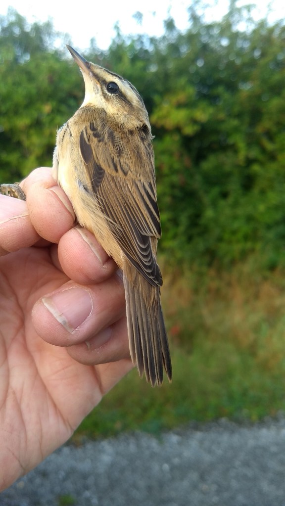 Our first round was very quiet: probably because of the mist. It was nice to get my team’s first Sedge Warbler of the autumn migration, the first bird out of the nets, followed by an early morning Wren.