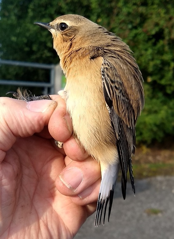 For the second round, I checked the perimeter track hedgerow nets (empty), whilst the others checked the plateau nets. They came back with a good haul of birds, and I thought that this could be a really good session. When Adam handed me a bag with a Wheatear in it, I knew that, for me, it was a red-letter day. I have ringed Wheatear before: having been lucky enough to process two on Skokholm back in September 2014, but that is it and I have never done one on my home patch. Checking the group records that are available online, the group has only ringed 13 of them in Wiltshire. The online records show data since 1989 – but it is probably only complete from 2000 onwards, as not all paper records have been digitised. The previous most recent Wheatear was processed back in September 2012 on Salisbury Plain. All of the sites that had previously caught Wheatear were transferred to the North Wilts Ringing Group when it split from the West Wilts Ringing Group at the beginning of 2013.