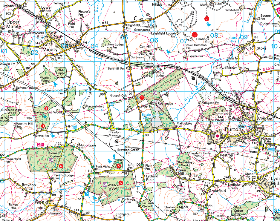 The unnumbered pink dot is the location of my garden. The numbered red dots are my Braydon Forest ringing sites and are as follows: