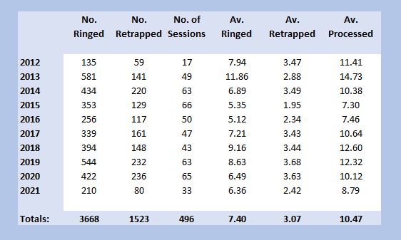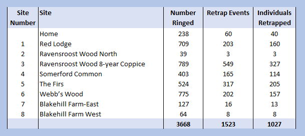 Because of this paper and its conclusions, I have been prompted to have a look at the Blue Tits I have ringed in my garden and the rest of my sites in the Braydon Forest and to see how they have moved around the area. I also had a look at those Blue Tits recovered within the Braydon Forest but ringed elsewhere. Since August 2012, when I started ringing in my garden, Ravensroost Wood, the Firs and Webb’s Wood, through until the end of September 2021, 3,688 Blue Tits have been ringed in the Braydon Forest. Of those ringed, there have been 1,523 subsequent encounters, representing 1,027 individual birds. In my garden, I have ringed 238 of the total caught and have retrapped ringed birds there on exactly 60 occasions, representing 40 individual birds.