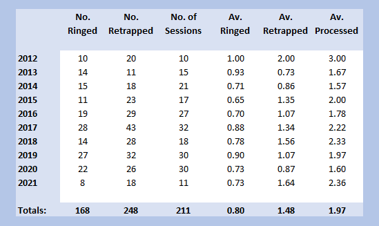 The number of sessions differs from Table 5 because it is recording those occasions on which Marsh Tits were caught, in the same way that I have only recorded the sessions in which Blue Tits were caught. Three of the Braydon Forest sites, the two at Blakehill and my garden in Purton, are entirely the wrong habitat for Marsh Tit and will never produce a catch. This year’s decline in actual numbers to date is entirely down to my being unable to access three of the most productive sites for the species for a significant part of the year. Ravensroost and Webb’s were out of bounds until September and July respectively, and Red Lodge has been out of bounds for the last two months, due to vandalism / fly-tipping and the access road being blocked as a result. However, there is no obvious trend either up or down. To put that into perspective, in two sessions in Ravensroost Wood in October I have ringed a further 3 Marsh Tits.