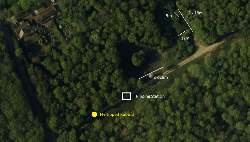 So, I decided that they weren’t going to stop me carrying on with my session. I was joined at 6:30 by Lucy and Miranda for the full session, and Rosie and her new Wildlife Trust colleague, Charlotte, for the start of it. We set nets by the pond and the feeding stations: just 6 nets: 4 x 18m and one each of 9m and 12m.