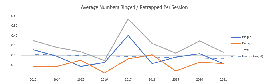 Given that we carry out our sessions with consistent net positions and consistent, although seasonally variable, session lengths, this does not look as though it shows a population that is growing rapidly within the Braydon Forest. As per my previous posts, I make no claims about the validity of this analysis, outside of the specified geographical parameters and the limitations of bird ringing for analysing population dynamics.