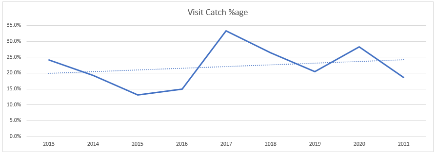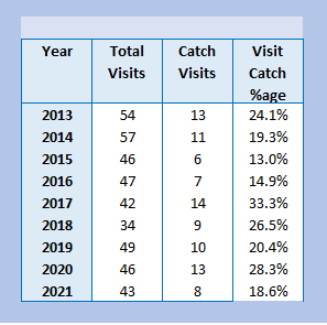 As you can see, over the nine years there has been a near 5% increase in the number of sessions in which we have caught this species. The next thing I looked at was the actual size of the catch: