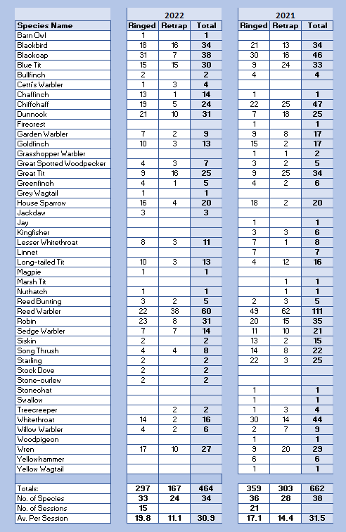 With migrants continuing to arrive, particularly the summer warblers I would expect to catch in the woods, at the farms and around the lakes at Lower Moor Farm, we missed out on a significant number of birds. Despite that, the average numbers are comparable with last year: