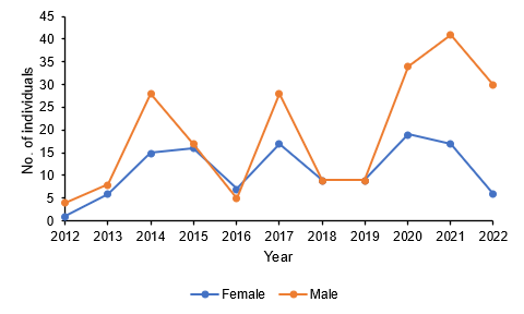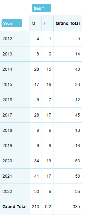- By year, there is considerable variation: in some years (e.g., 2018 and 2019), there are about equal numbers of each sex, but in others (e.g., 2021, 2022) there are more than twice as many males as females.