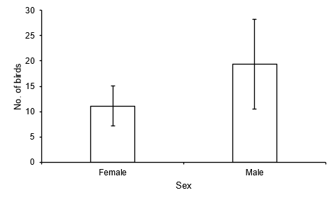 The mean (± 95 % confidence interval) numbers of female and male Blackcaps processed each September were significantly different from each other (paired samples t-test: t = 2.842, d.f. = 10, p = 0.017).