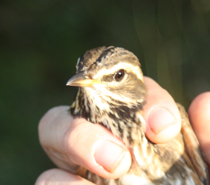 On the way back from having set the nets, we took the first bird out of a net: a Robin, from the net nearest the ringing station. The first bird is usually one of Robin, Wren or Blackbird. Given the potentially fluid situation, with birds migrating in and out, I put on a fairly eclectic mix of lures: Redwing, Lesser Redpoll and Siskin for species coming in, Blackcap for species currently going out. Two of the four worked.