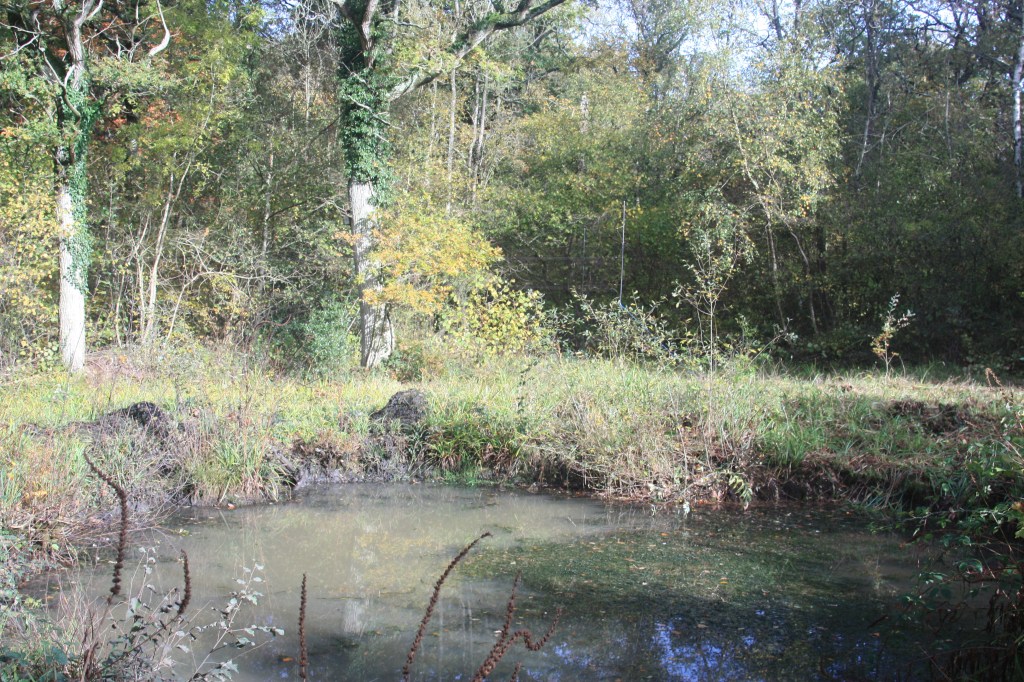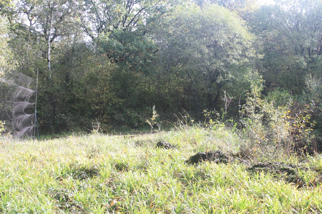 When I arrived Monday, Rosie and another member of the estates team were busy clearing up the latest fly-tipping incident: a load of soil, some paving bricks and a fibre palette. They were also chatting to Jacqui, one of the key Ravensroost volunteers (plants and fungi her speciality). So I told them that I planned to ring at the pond this Saturday. Rosie told me that the Trust planned to clean out the pond over the winter. Guess what? It seems that on Wednesday the Ravensroost volunteers decided to clean it out then. Not only that, but they decided to clear the entire scrub area around the pond. When I turned up this morning, this is what I found: