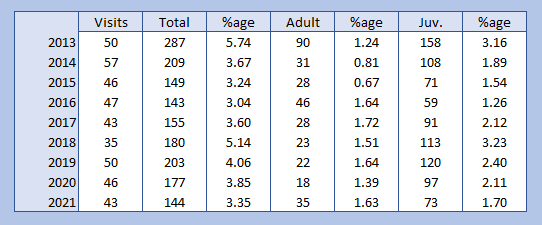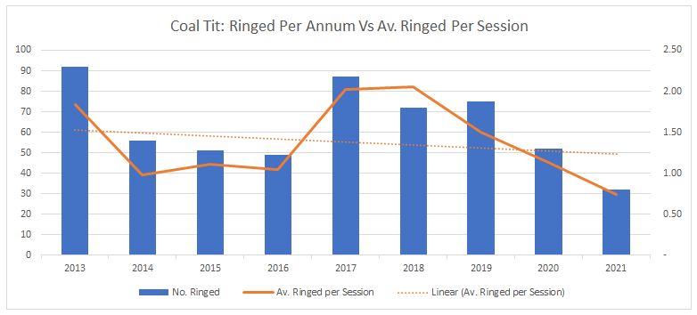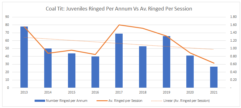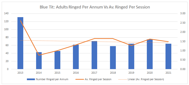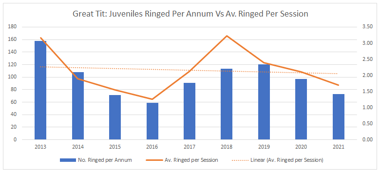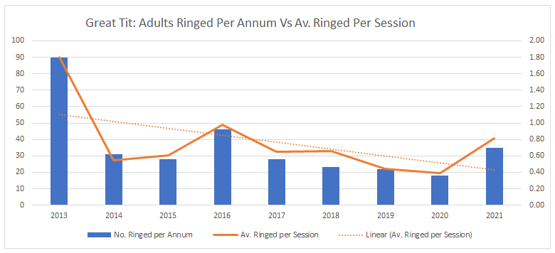 Although there was a short spike in 2021, the overall trend for Great Tit ringing is downward. It would seem to be mainly a reduction in the ringing of adult birds, with a reduction from 1.4 to 0.4 over the period. That certainly looks like a significant reduction. Compare that with the juveniles, where the trend is much shallower: from 2.8 to 2.2. Overall, the reduction is from 4.3 to 3.7. Interestingly, I have looked at the catch for 2022 to date and they are quite interesting: 110 have been ringed so far this year, 98 juveniles and 12 adults. It looks like it will be very similar to 2021.