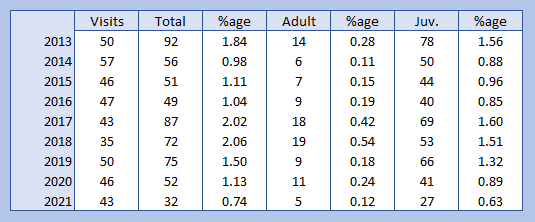 Conclusions: Obviously, the Blue Tit data is the most reliable simply because of the volume of data. That their figures seem to be stable across both juveniles and adults does rather fly in the face of the idea that their numbers are increasing significantly. This also ties in with the data from the BTO’s Breeding Bird Survey which shows zero change in results between 1995 and 2018.