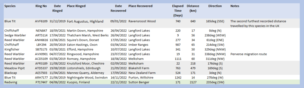 The key recoveries in this section are the Finnish Redwing and, funnily enough, the first Blue Tit in the list. The only other foreign recovery we have had of Redwing was a bird ringed at Lower Moor Farm in October 2015 and shot by some (expletive deleted) in France in December 2017. Having just checked the BTO on-line ringing reports, it looks as though this is the furthest movement of a recovered Redwing in the UK. The previous highest was a mere 1,905km!