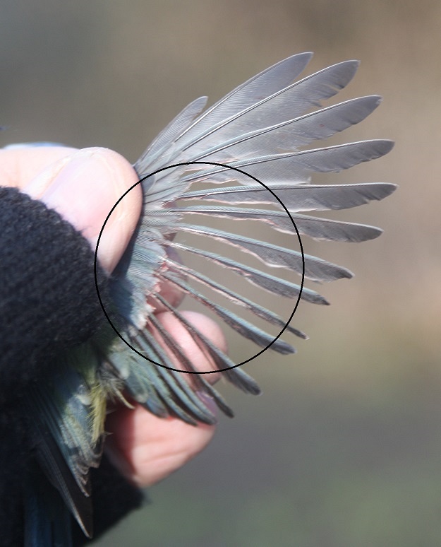 Both Blue Tits were recaptures. One of them, ringed in 2021, was clearly having a problem with its right wing. The left wing was fine.