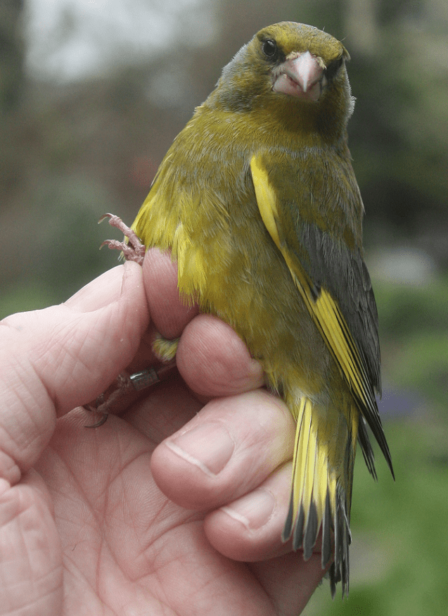 I caught my first bird at 11:40: a female Greenfinch. As part of our BTO Garden Birdwatch Scheme observations, we have recorded pairs of Greenfinch coming to our feeding station (okay, for GBW notation, four Greenfinch maximum in the garden at any one time). Today’s results showed how different casual observation is from physically catching and noting what you find. By the end of the session I had caught and processed seven Greenfinch: four females and three males. Interestingly, of the four females, three were second year birds and the fourth was a fourth year bird. The three second year birds had extremely well-developed brood patches, ready to brood eggs, but the older bird was still defeathering her brood patch and looked as though she would need another couple of weeks before she would be ready to start laying. This is her: