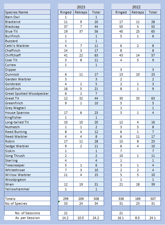 Of the additional species this April, one was Barn Owl and another was Buzzard, both ringed pre-release at Oak & Furrows. Yellowhammer, Great Spotted Woodpecker and Kingfisher were also additional to last April. Missing this April were Dipper (not for want of trying), Grey Wagtail and Woodpigeon. Jonny and I did have a go for Dipper last Thursday. Unfortunately, the Bybrook is still running hard, fast and high and there was no sign of Dipper where we set up, although the site is a known Dipper territory. We plan to try again elsewhere this week.