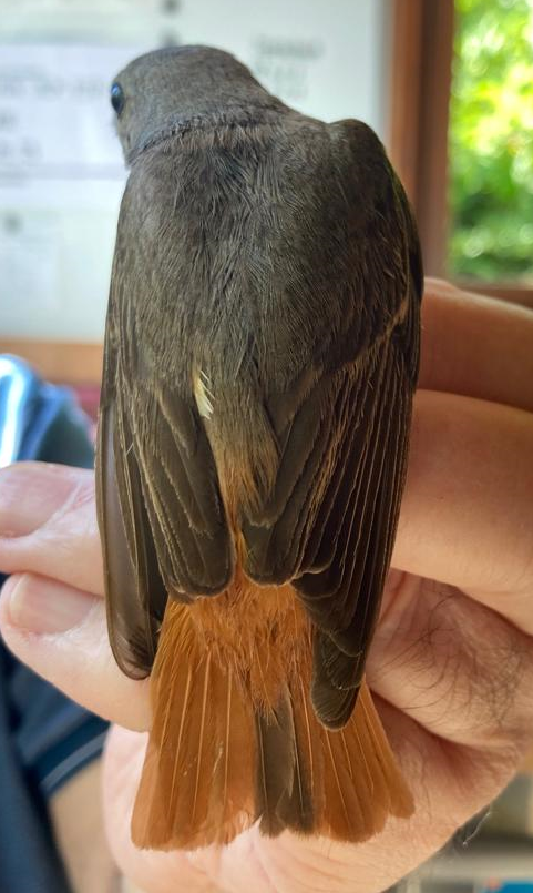 Neither Rosie nor Anna have processed a Pied Flycatcher before, Rosie processed this one. It had already been ringed a couple of days before, so it was processed as a recapture. In fact, it was seen every day of the weekend, but not captured again. Although it is very brown in colouration, it is a second year male. This is identified by the two white spots on the forehead, one either side of the beak. The tail was blackening up, to add further evidence as to its sex: