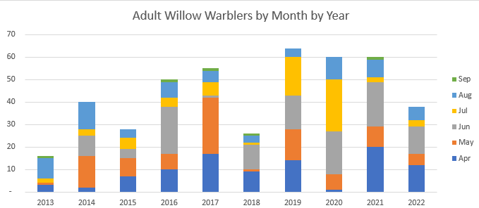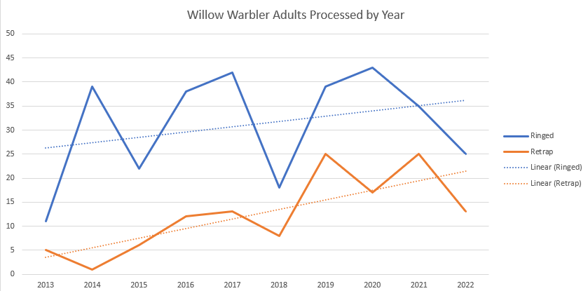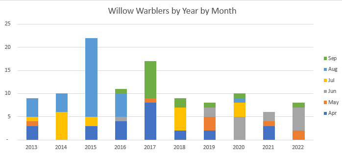 After the publication of the last monthly results, one of the senior members of the group mentioned the ongoing decline we seem to be experiencing in the numbers of Willow Warbler we are catching and processing. I have had similar thoughts, so, as there is no chance of opening nets in this current weather, I decided to have a look at the figures to see if it is the case. The data set covered the full years from 2013 to 2022 inclusive.