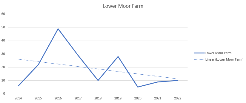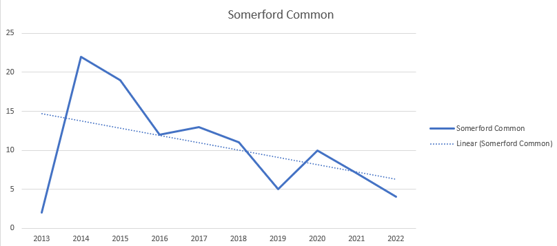 To examine what might be happening at the three sites I mentioned previously, which would explain why I think the species is in decline in my area, I did similar graphs for the Ravensroost Complex, being the site most frequently surveyed over the period: