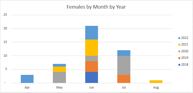 Perhaps the crucial questions are: are there changes to the breeding population or a change to passage movements? I had a look at the results for males and females in breeding condition. Unfortunately, prior to 2018 there is a dearth of records of the bird’s sexes. They aren’t easy: females can only be sexed by the development of a brood patch and males by the development of their cloacal protuberance. The results were as follows: