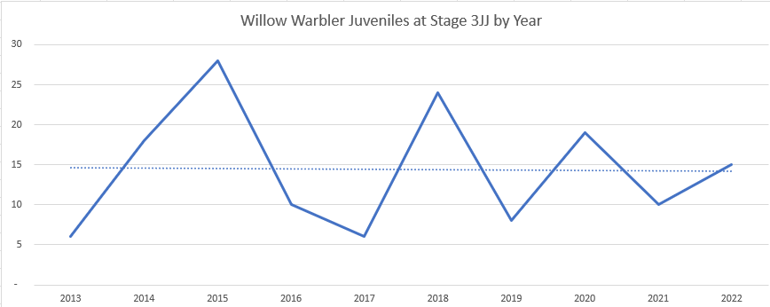 What do I mean by that? As well as identifying juveniles as 3J, there is a subdivision, based on moult, of either 3JJ or 3JP. 3JJ is a bird in full juvenile plumage, whereas 3JP is a bird undergoing post-fledging moult. I tend to the idea that a bird with a 3JJ moult code had to have fledged within the local area. Not necessarily at the site at which it is caught but certainly not yet on migration. Birds that are undergoing post-fledging moult have fledged somewhat earlier and could possibly be on migration. (Once they have completed their post-fledging moult, they lose the JP subscript and become simply an age code 3 (with a moult code of O for “Old”, somewhat ironically).) So I decided to have a look at the number of 3JJ youngsters caught at the sites: