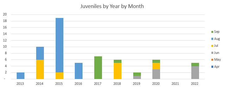 Even though 2022 totally distorts the picture if looking at raw totals, with the exceptions of 2020, you can see that August is certainly the busiest month for juvenile birds. With so few in September it would seem that August is the key month for autumn migration for this species.