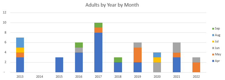 However, the figures are distorted by a quite remarkable passage of 100 juvenile birds in August 2022. If you have a look at the split by month, it is pretty clear that our birds are mainly on passage, either in the Spring or the Autumn: