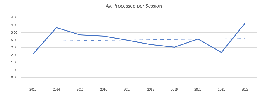 The trends are still upwards, which was definitely counterintuitive. However, one of the other things that need to be considered is the amount of effort put into catching and processing the species over the period. So I counted the number of sessions run between the beginning of April and the middle of September each month, whether Willow Warblers were caught or not, and worked out the average catch per session by year: