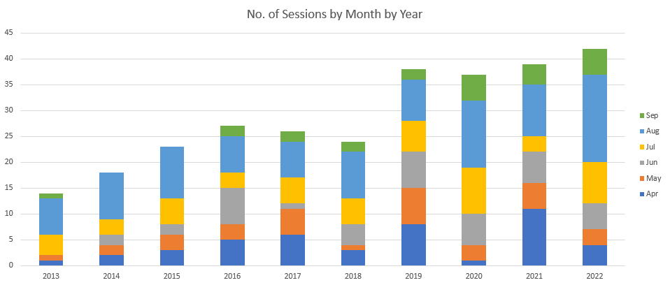 There is a slight increase over the period, despite a blank in 2014, in which 14 sessions were carried out in the complex between the beginning of April and the end of September. Clearly Spring passage is the busiest, as shown for the figures for April and May in every year except 2020. However, that was down to Covid restrictions.