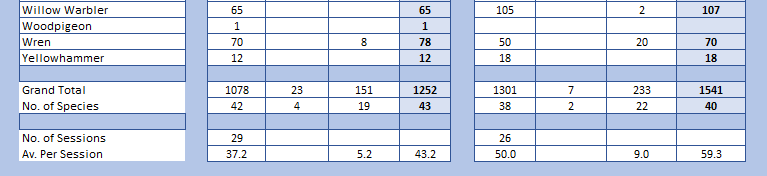 The key declines in numbers were in some of our summer visiting warblers: Blackcap down from 195 to 131; Reed Warbler down from 100 to 35; Sedge Warbler from 89 to 28 and Willow Warbler 107 to 65. Chiffchaff were 176 down from 193 but that was a decline in the number retrapped: the number ringed was 169 in both years. Garden Warbler numbers were stable at 13 and 14 respectively. Swallow numbers were boosted by my team carrying out a number of nest visits and ringing nestlings. Tree Sparrows by Jonny’s taking over a number of Tree Sparrow nest boxes this summer.