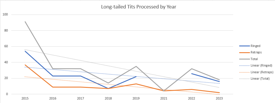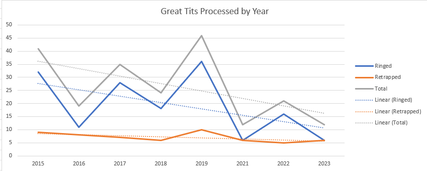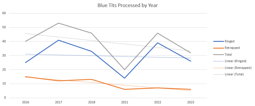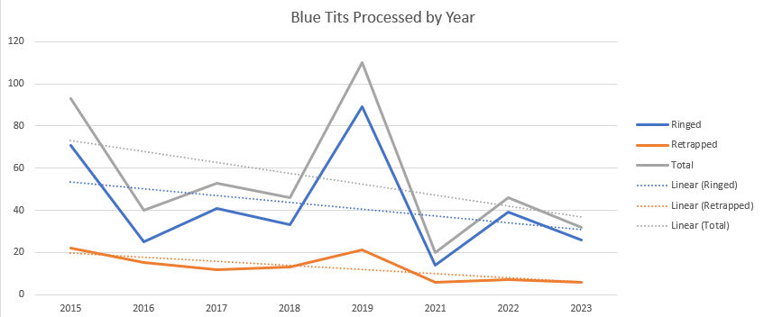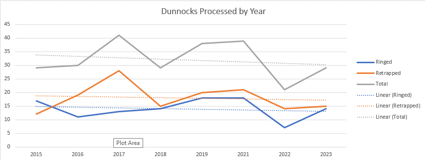 As you can see from this, the trend for birds ringed is pretty well static and the decline in retrapped birds is rather shallow. Overall, they are a consistent contributor to our CES sessions.