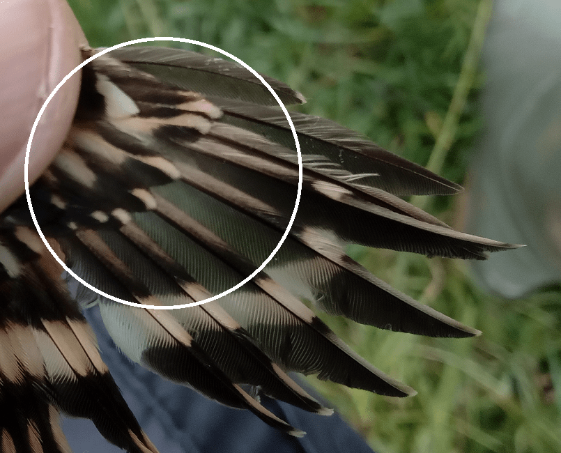 Our weather recently has been bouncing between extremes of heat, strong winds and rain, occasionally torrential. This has an impact on parent birds ability to feed their young. As a result, feather development in young birds can reflect those difficulties, with distinct barring as the feather growth is interrupted or held back by lack of food. These are called “fault bars”. We found an excellent example in a Blackcap we caught towards the end of the session. When we looked at the tail feathers the barring was very obvious: