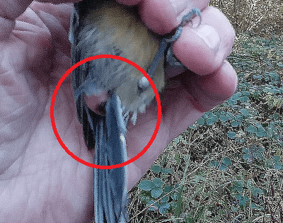 I was joined this morning by Rosie and Claire and then, slightly later, by Teresa and Andy. We set the usual nets in the places used for the last few sessions and I put on a variety of lures. It was a slow start with the first bird not out of the nets until 8:40. However, the next round delivered a small flock of Long-tailed Tits, a Goldcrest and a Wren. After that it went empty, four, empty, empty, three, empty and empty. I was getting pretty fed up with the lack of birds but then we had a surprising round of sixteen birds: mainly Great Tits, but our only Blue Tit of the day, a Coal Tit and three Goldcrests. However, we could only ring sixteen of the seventeen because one of the Great Tits presented like this: