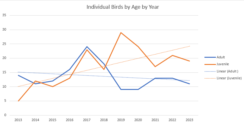 Retrapped birds can distort the picture, so I did a quick analysis of the numbers of individual birds by age group and year to give a better indication of how things are going for them:
