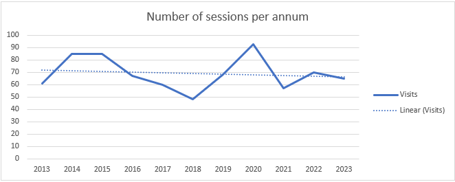 As you can see from the graph, although there are annual fluctuations in the number of sessions, the overall trend is pretty constant. The initial series of tables and charts show simply the proportion of the total number of catches in which each species is caught:
