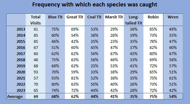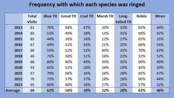 What do these tell us? Before looking at the data there is a caveat regarding Coal Tit and Marsh Tit. Neither have ever been caught at Blakehill Farm nor has Marsh Tit ever been caught in the village of Purton: it is down to a lack of appropriate habitat. Because of this I have not counted those sessions in the analysis of these two species. What surprised me was that, as per table 1, we actually catch the Robin more frequently than any other species: anecdotally I would have put money on it being Blue Tit. Equally, to find that the frequency with which we ring Robin is the same as the frequency with which we ring Blue Tit is also interesting.