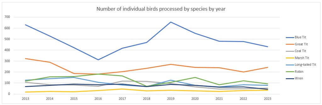 So to actual numbers caught. It is no surprise that the Blue Tit has the largest catch size. When talking about numbers, instead of adding the number of birds ringed to the number of retrapped birds, which gives a false reading because many birds are caught multiple times, I counted the actual number of individual birds processed each year. These are the results: