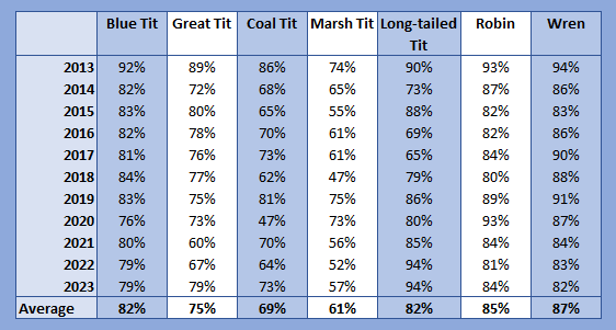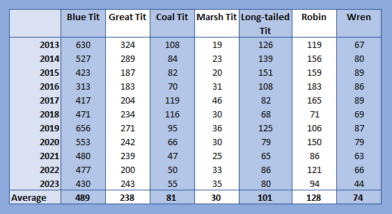With the weather playing havoc with potential ringing sessions last week, and projected until Friday of this week, I needed something to fill the time. I decided to have a look at our activity levels in the Braydon Forest and how that reflected in the catching of our commonest small resident species, namely the Paridae: Blue, Great, Coal and Marsh Tits, plus Long-tailed Tit, Robin and Wren.