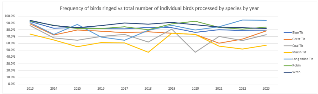 So, looking at the bald numbers, Blue Tit is far and away the largest catch, as expected. Unsurprisingly, Marsh Tit is the lowest catch. However, what proportion of each species caught is ringed?