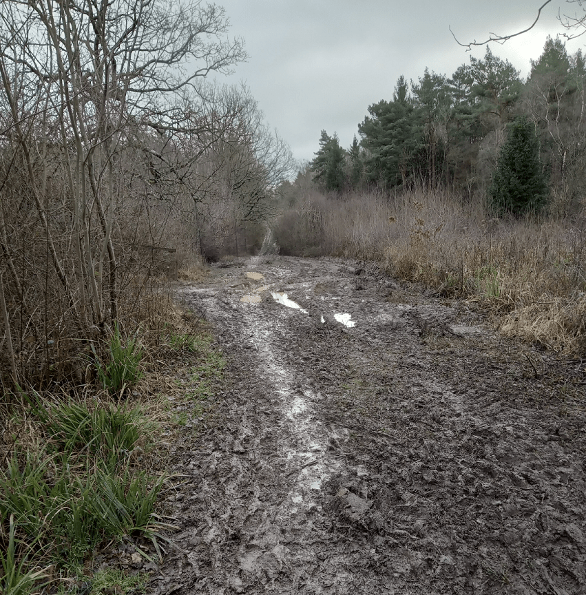Section 1 is where our feeding station is set up during the winter months: it also happened to be the last section mulched two years ago. On Wednesday I went and topped up the feeding station and saw that section 2 was in the process of being mulched. The noise was significant, and I didn’t think it would be conducive to ringing there on Friday, as I had arranged. However, they did look like they were getting on with it, so I went back on Thursday and was pleased to find that they had finished. I went to check on the feeders and was rather less pleased to find the state of the main path: hence the reason for the punning title to this piece. They had clearly brought some very heavy machinery in through this end of the paddock to collect up the brush. I don’t quite understand why: there was an access point from the main carpark to the north of section 2. Whatever they brought through left astonishingly deep ruts and massive pools of mud and water, exacerbated by heavy overnight rain last night.