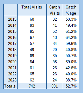 Clearly, the key factor in the overall decline has been the reduction in the catch over the last three years. There is no obvious reason why this should be the case. Worrying.